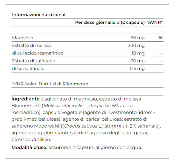 Con estratto di Melissa Bluenesse®, Zafferano Moodreal® e Magnesio bisglicinato;
