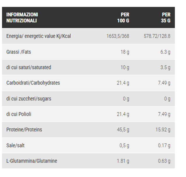Ingredienti: [maltitolo, grassi vegetali non idrogenati (olio di cocco, burro di cacao, cacao nelle versione cioccolato latte o fondente), latte magro istantaneo, EMULSIONANTE: lecitina di girasole, sale, aromi naturali.] proteine idrolizzate del siero del latte (Carbery Optipep® 90 ist. DH4), L-Glutammina Kyowa Quality®, riso soffiato, sucralosio.