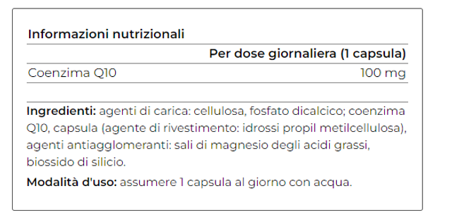 Il Coenzima Q10 è un potente antiossidante che protegge le membrane cellulari dal danno ossidativo, aiutando a rinforzare il sistema immunitario, che favorisce la fisiologica funzione cardiaca e la sua protezione, intervenendo nel mantenimento della salute neurocerebrale, nel mantenimento della fertilità maschile, nel contrastare le conseguenze degli stati diabetici,ed esplica una interessante azione "antiaging" cutaneo