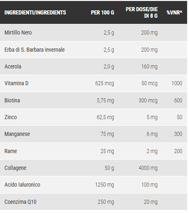 Integratore alimentare a base di collagene, acido ialuronico, coenzima Q10, vitamine, minerali ed estratti vegetali. L’estratto di Erba di Santa Barbara invernale favorisce il drenaggio dei liquidi corporei ed il trofismo e funzionalità della pelle, mentre lo Zinco la Biotina contribuiscono al mantenimento di una pelle normale. Inoltre lo Zinco contribuisce anche al mantenimento di unghie e capelli normali. Il Manganese contribuisce alla normale formazione di tessuti connettivi, mentre il Rame contribuisce al mantenimento di tessuti connettivi normali. L’estratto di Mirtillo Nero favorisce la funzionalità del microcircolo (pesantezza delle gambe). L’estratto di Acerola favorisce le naturali difese dell’organismo, mentre Zinco e Vitamina D contribuiscono alla normale funzione del sistema immunitario. Il prodotto non contiene lattosio.