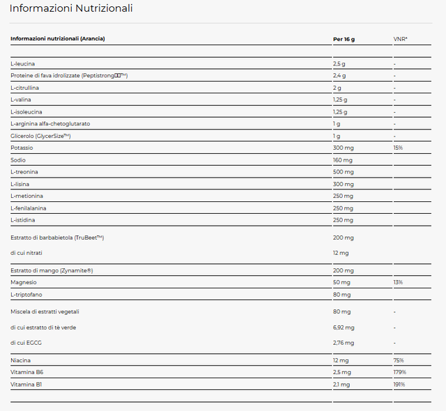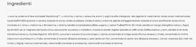 - Con aggiunta del peptide Peptistrong™ per mantenere la massa muscolarePresenza degli estratti vegetali Zynamite® e TruBeet™ con funzione antiossidante