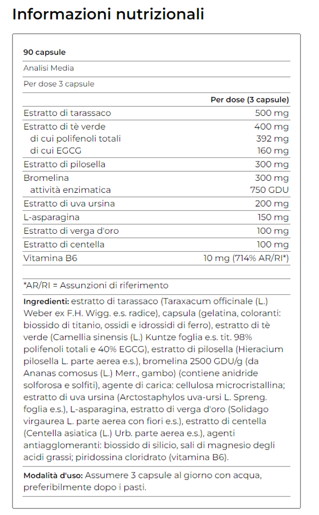 A base di tarassaco, tè verde, pilosella, bromelina, uva ursina, l-asparagina, verga d'oro, centella