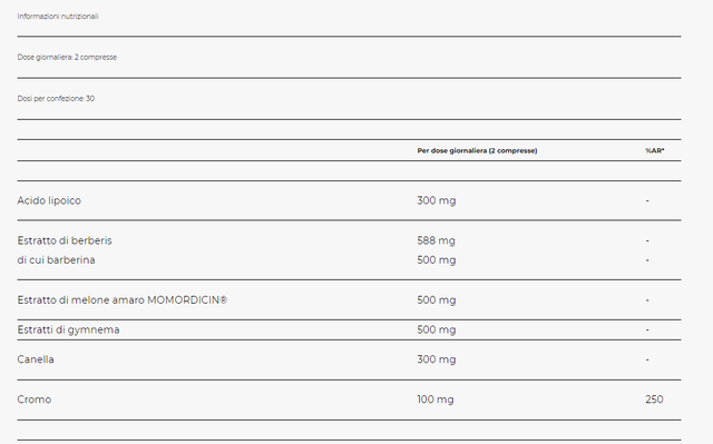 A base di berberina, melone amaro, gymnema, cannella, acido R-alfa lipoico e picolinato di cromo
