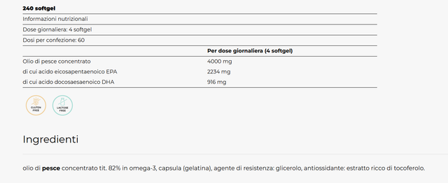 Si tratta di olio di pesce in forma trigliceride purificato e concentrato certificato 5 stelle IFOS che apporta per dose (4 softgels) ben: