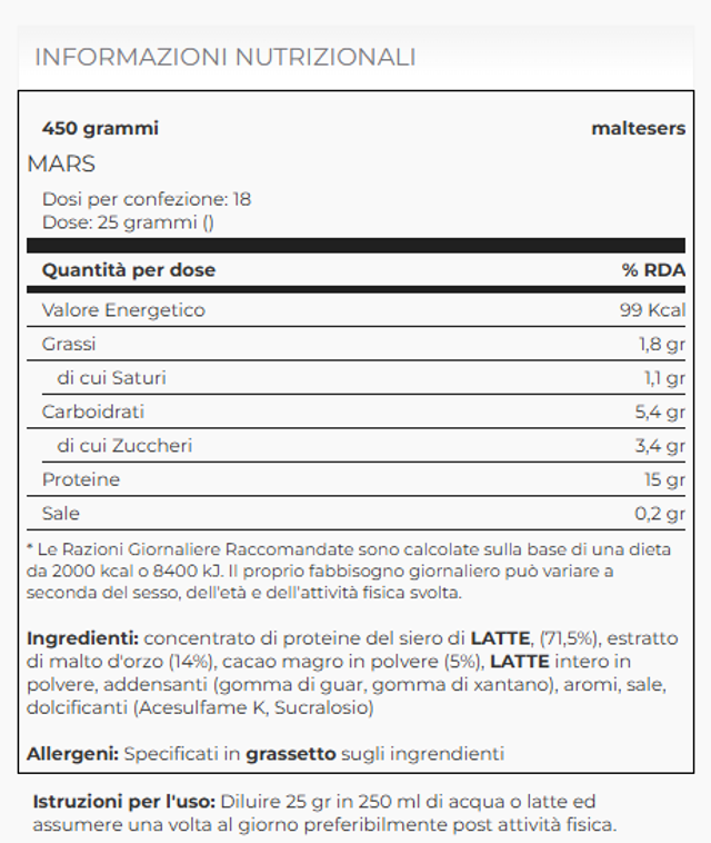 Maltesers Hi-Protein Powder 450g Mars Nutrition, si tratta di una proteina in polvere realizzata con il 100% di concentrato dal siero di latte WPC ad alto valore biologico e quindi ricca di amminoacidi essenziali.