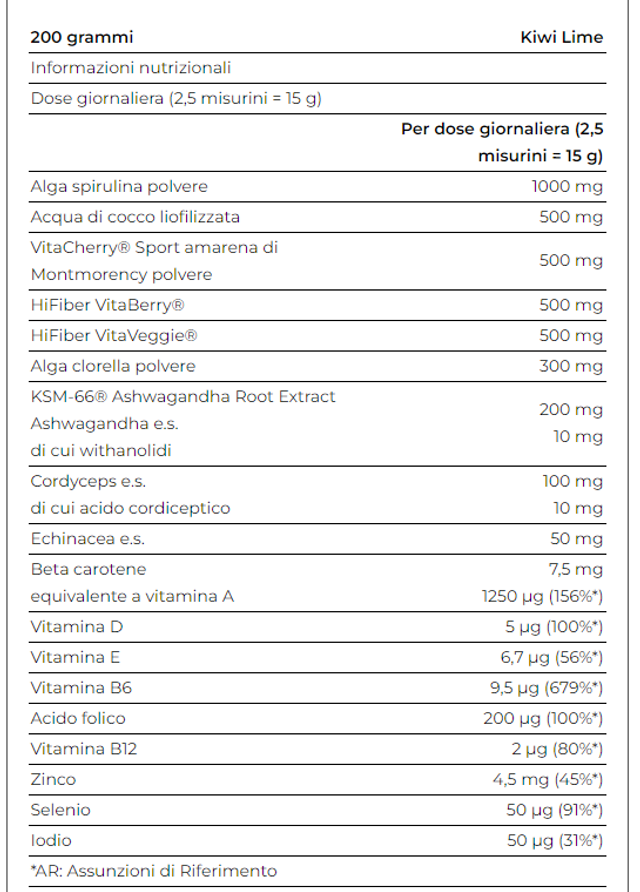 Con Alga spirulina, Acqua di Cocco, VitaCherry®, VitaBerry®, VitaVeggie®, Alga clorella, Ashwagandha KSM-66®, Cordyceps ed Echinacea;