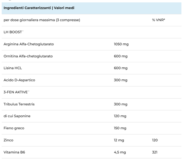 TesToJet è la combinazione degli aminoacidi Arginina/Lisina/Ornitina con Acido D-Aspartico, estratti secchi titolati (Tribulus Terrestris e Fieno Greco) e Zinco contribuisce al mantenimento dei normali livelli di testosterone nel sangue, alla normale fertilità e riproduzione ed alla normale funzione del sistema immunitario. Ingredienti: Arginina alfa chetoglutarato, Ornitina alfa chetoglutarato, Lisina cloridrato, agenti di carica: cellulosa microcristallina, gomma arabica; Acido D-Aspartico, Tribulus (Tribulus terrestris L.) frutto e.s. 40% saponine, Fieno greco (Trigonella Foenum Graecum L.) semi e.s. E:D 1:4, Zinco monometionina, agenti antiagglomeranti: sali di magnesio degli acidi grassi, biossido di silicio; Piridossina Cloridrato (Vitamina B6).
