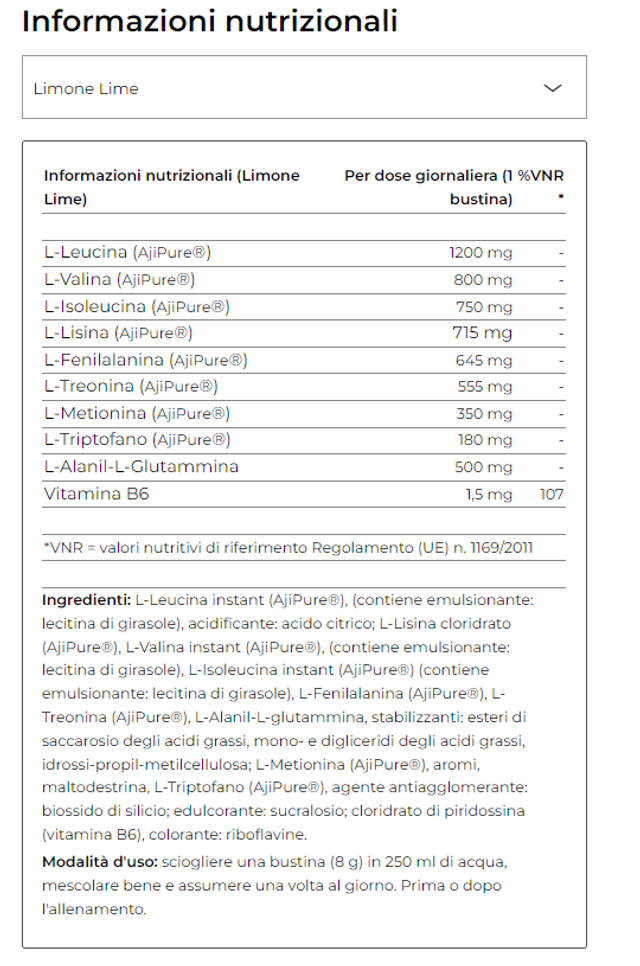 100% aminoacidi essenziali (EAA) da fermentazione vegetale con aggiunta di l-alanil l-glutammina